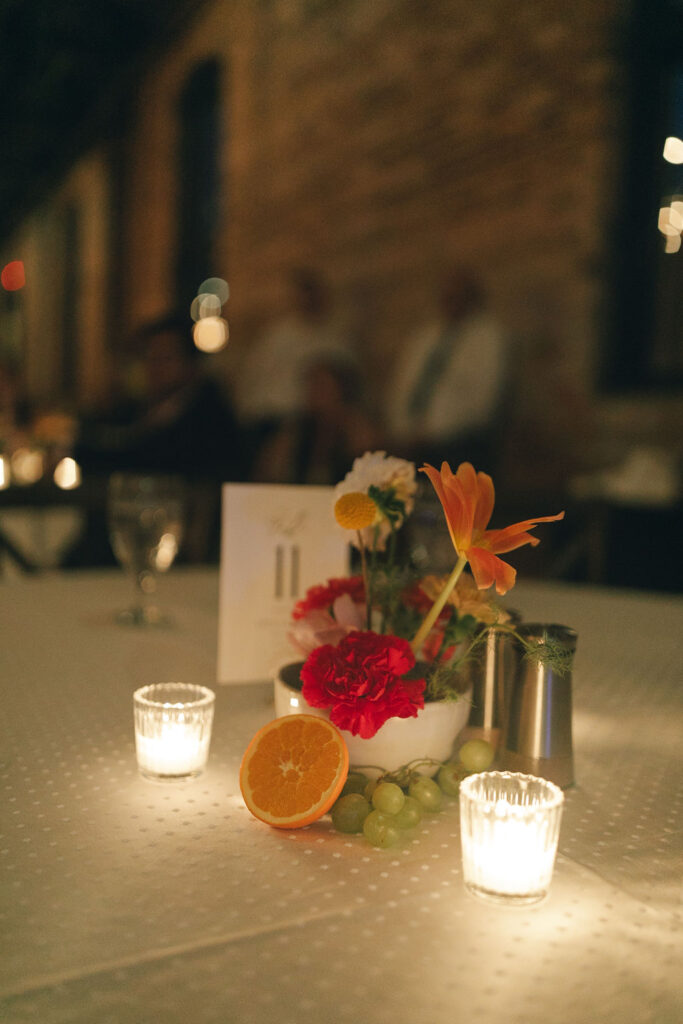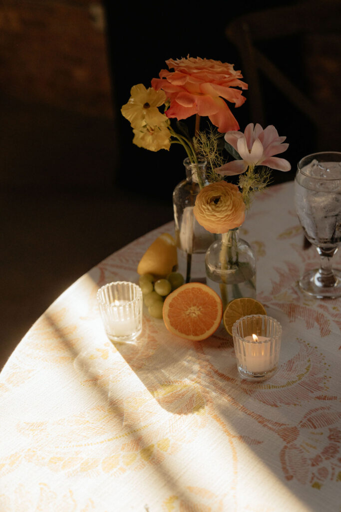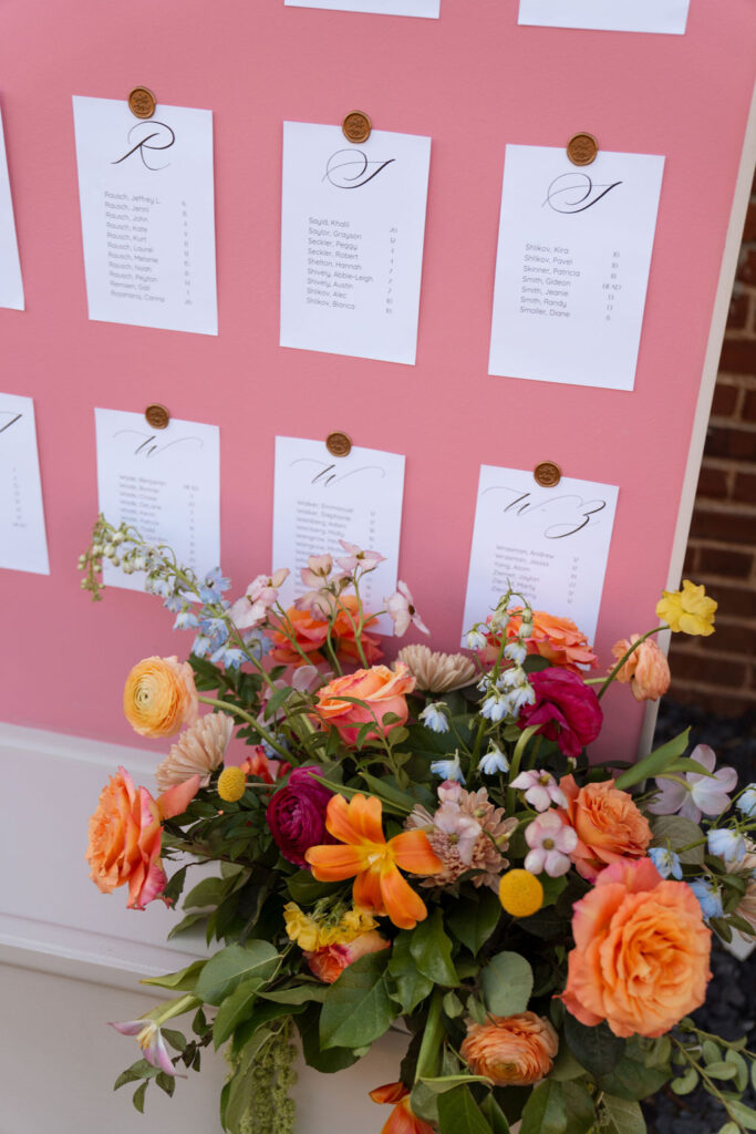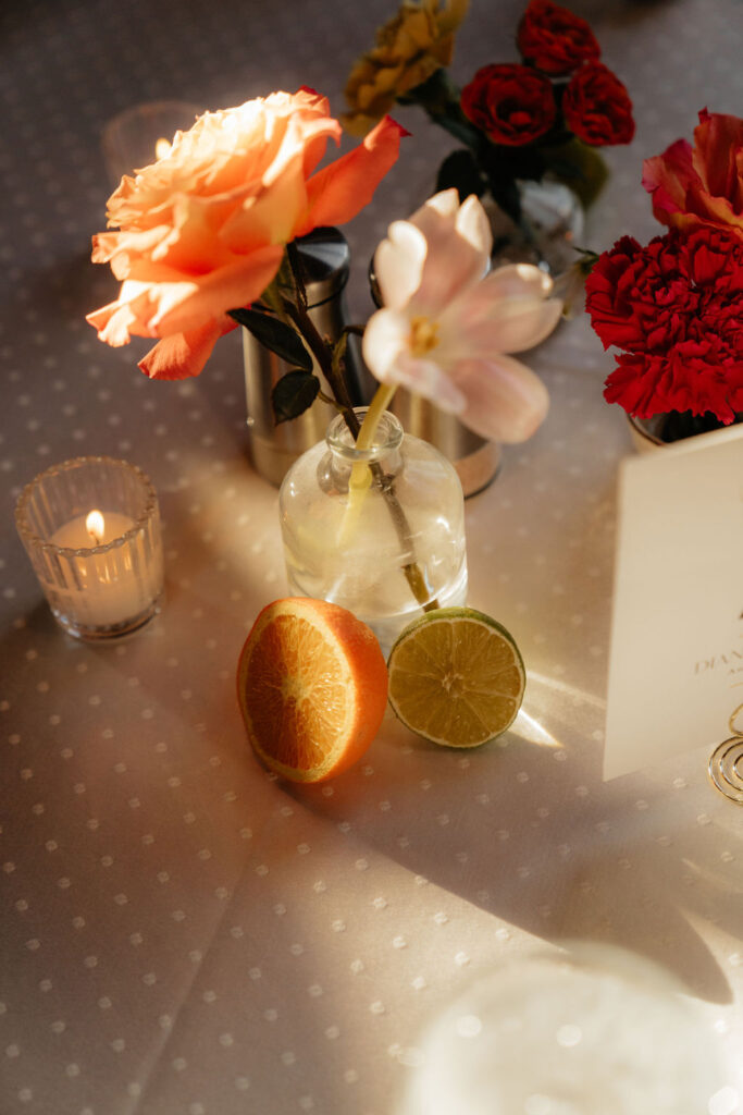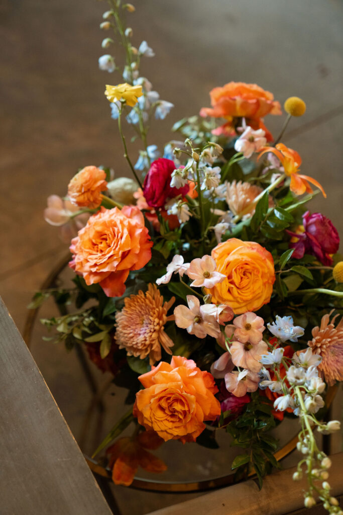 Diana and Nick wanted their wedding to feel colorful, citrusy, and whimsical, so we built their floral story around a palette of vibrant oranges, yellows, pinks, whites, and touches of blue. To give the palette depth, we softened the tones in certain areas, allowing each hue to shine without overpowering the others.