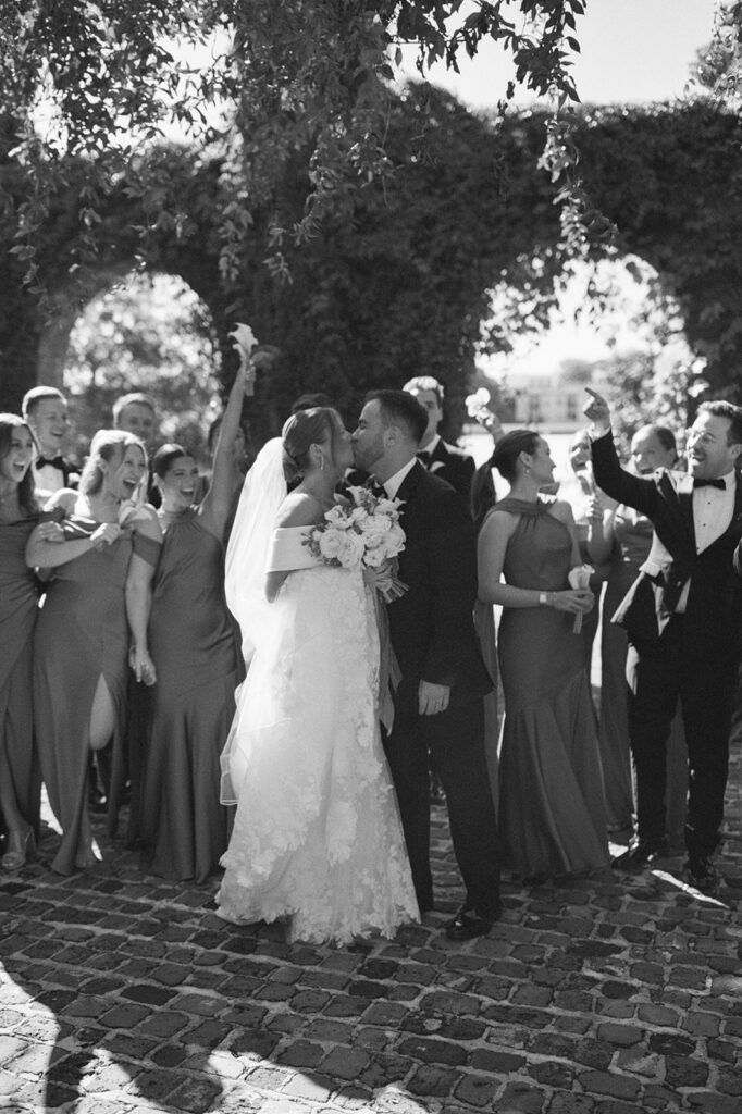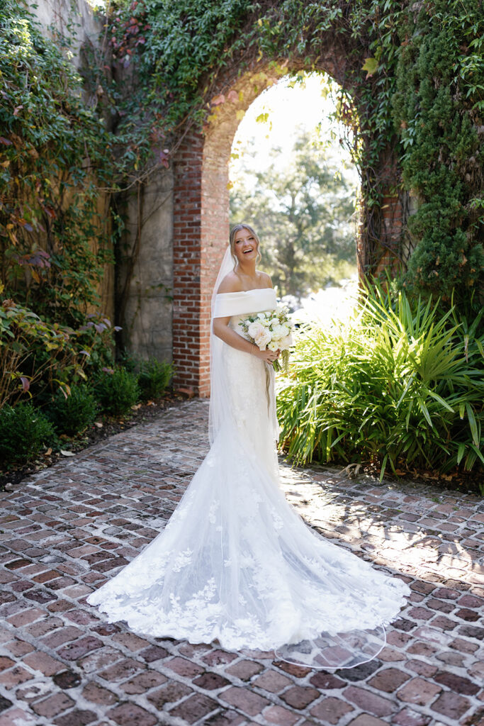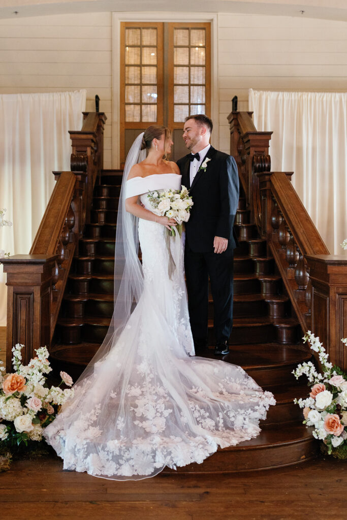 It was a beautiful day in early October — the kind where the Georgia heat had finally eased, leaving the air perfectly warm and comfortable. Caroline wore a stunning off-the-shoulder gown with delicate lace details that felt effortlessly romantic. Jake and his groomsmen looked sharp in classic black tuxes with bowties, while the bridesmaids added softness and elegance in light mocha satin gowns in a variety of styles.