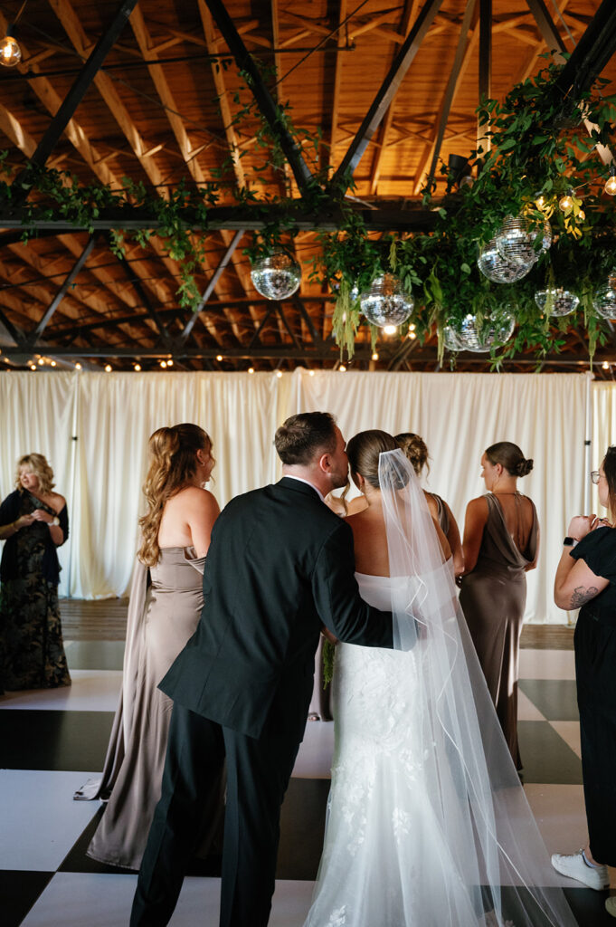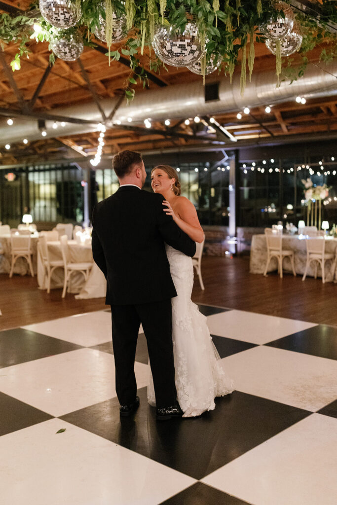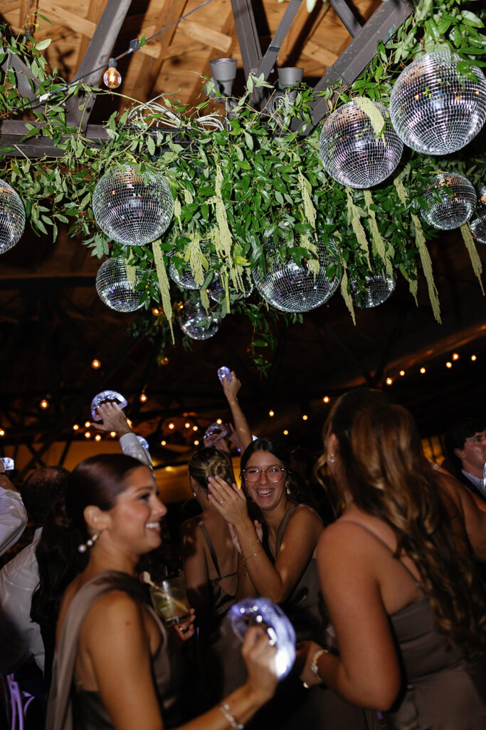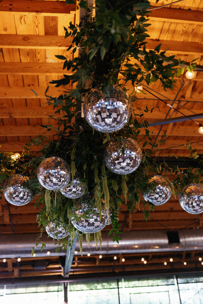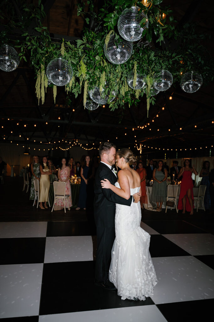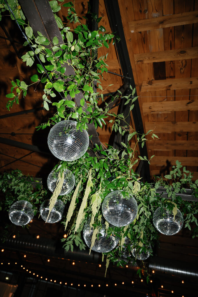 But the focal point? A suspended floral installation over the black-and-white checkered dance floor, featuring hanging disco balls, greenery, and amaranthus. It was bold, romantic, and created a true wow moment for guests as they danced the night away beneath it.