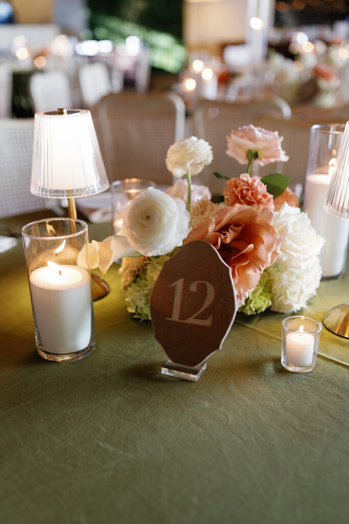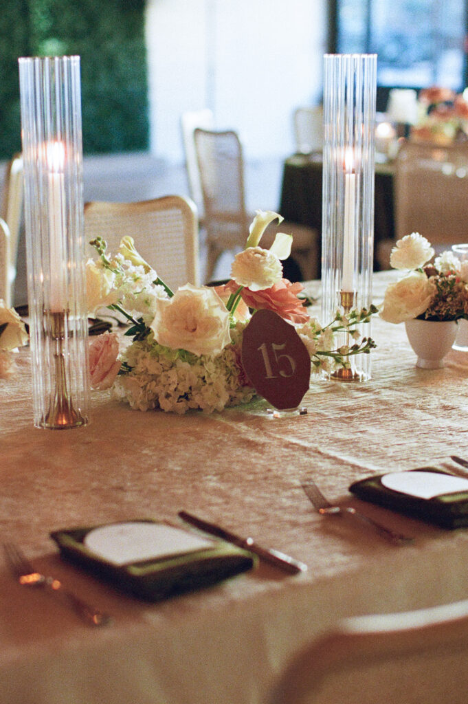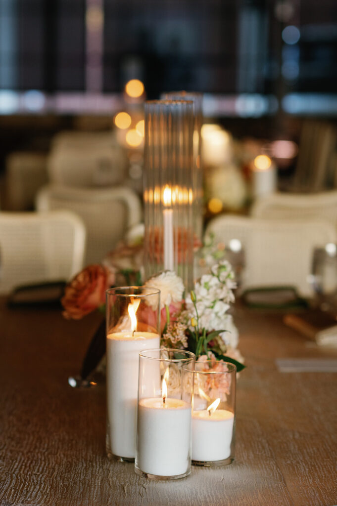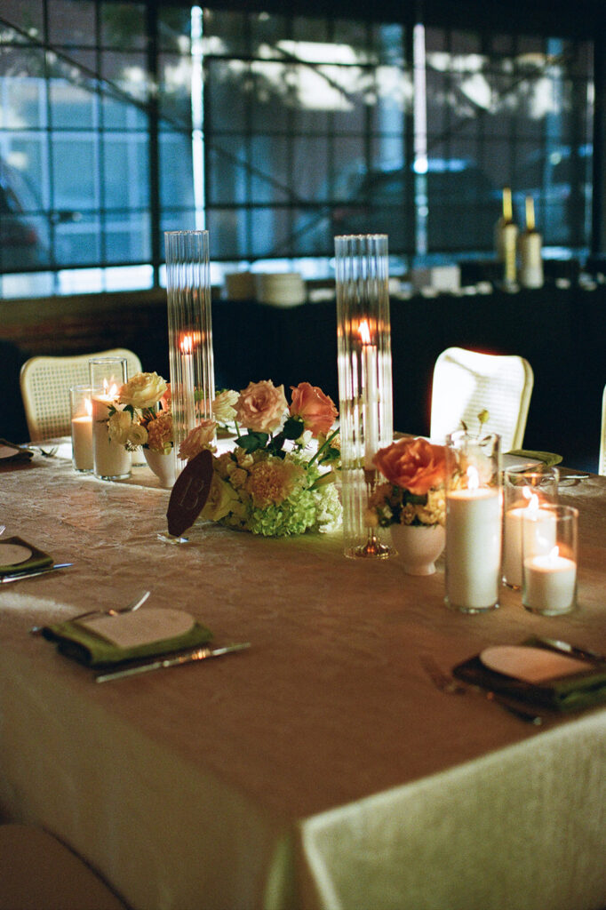 Candles in every form — tapers, pillars, and votives — layered in with patterned linens and warm lighting to add depth and intimacy. We’re especially grateful to Jackson & June Events for their thoughtful design direction, including the choice to upgrade to specialty linens that made a huge impact on the overall look.
