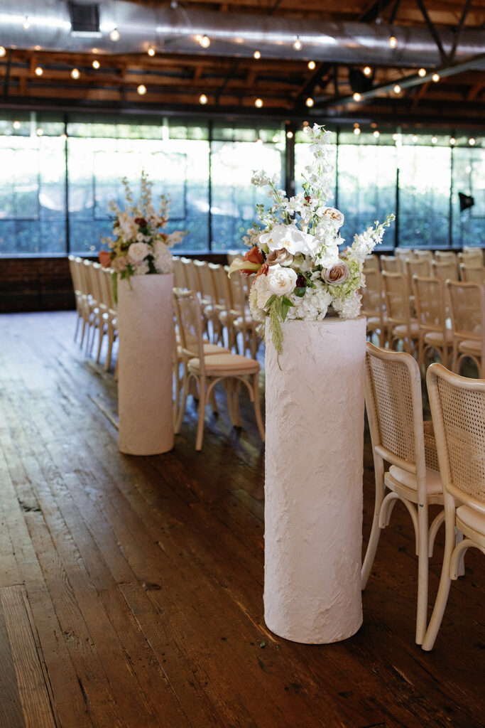Caroline and Jake’s Summerour Studio wedding in Atlanta was a romantic, elevated celebration filled with intentional design and high-energy moments from start to finish. As their floral designers, we were honored to help bring their warm, organic vision to life through layers of texture, creative structure, and meaningful touches.
