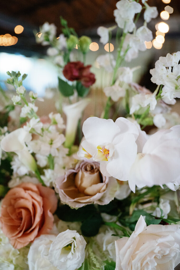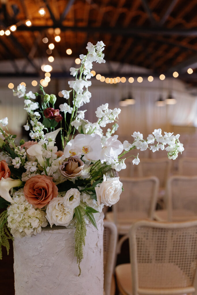 Guests arrived with excitement and joy — a mood that stayed high all evening. As floral designers, we worked closely with the planning team at Jackson & June Events to create a ceremony design that felt both elevated and personal. Soft neutrals — browns, beiges, whites, blush, greens, and mauve — anchored the palette, offering a fresh, natural feeling from the very start.